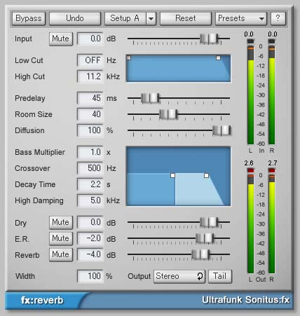 Lexiconでもいいかなっと思ったんだが(SonitusのReverbはイマイチ使い方がわからんのだ)Lexiconのリバーブは効き過ぎてオペラみたいっつーか風呂場で唄ってるみたいになるっつーかそれこそ丁度良い設定がイマイチわからんので今回はSonitusで適当にかけてみました。